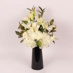 3 Stems White Oriental Lilies, 2 White Hydrangeas, 5 White Calla Lilies, 3 White Carnations, Leaves and Fillers - 10 Single Ruscus and 1 Stem Lipidium, Prepared in a Black Glass Vase - 12x25cm.