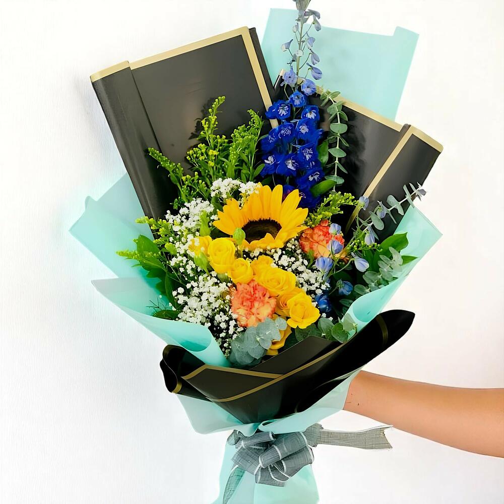 Sunflower - 1 pcs delphinium blue - 1 pcs spray rose yellow - 2 pcs fillers n leaves - 6 pcs