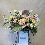 Presenting an elegant collection from our Flowers in a Box series. This stunning arrangement is composed of 2 Statice, 2 vibrant Gerberas, and a subtle grace of 2 Pistachios. Enhancing its aesthetic appeal, it also includes 2 Dinara pink spray roses, 2 Reflex baby roses, 3 Esperance roses, and is completed with the flawless beauty of 2 button white Chrysanthemums. This marvelous mix is sure to make a statement in any setting, perfect to express love, gratitude, or simply to brighten up your day.
