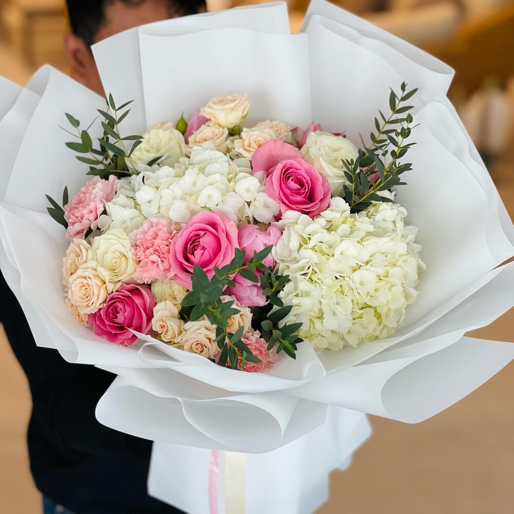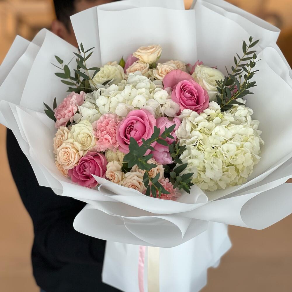 Eucalyptus - 3 pcs Spray rose - 3 pcs Hydrangea - 2 pcs Tulip - 3 pcs carnation - 3 pcs single rose - 9 pcs