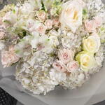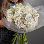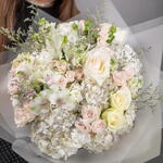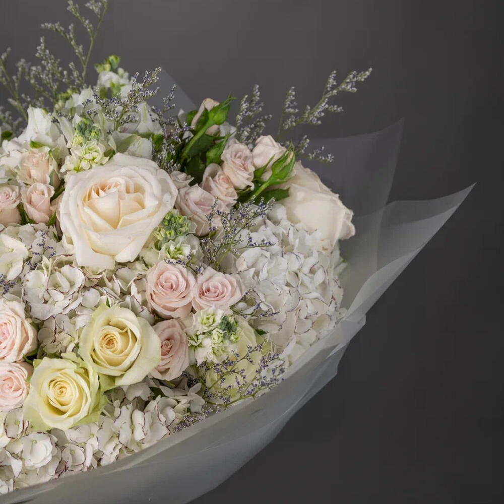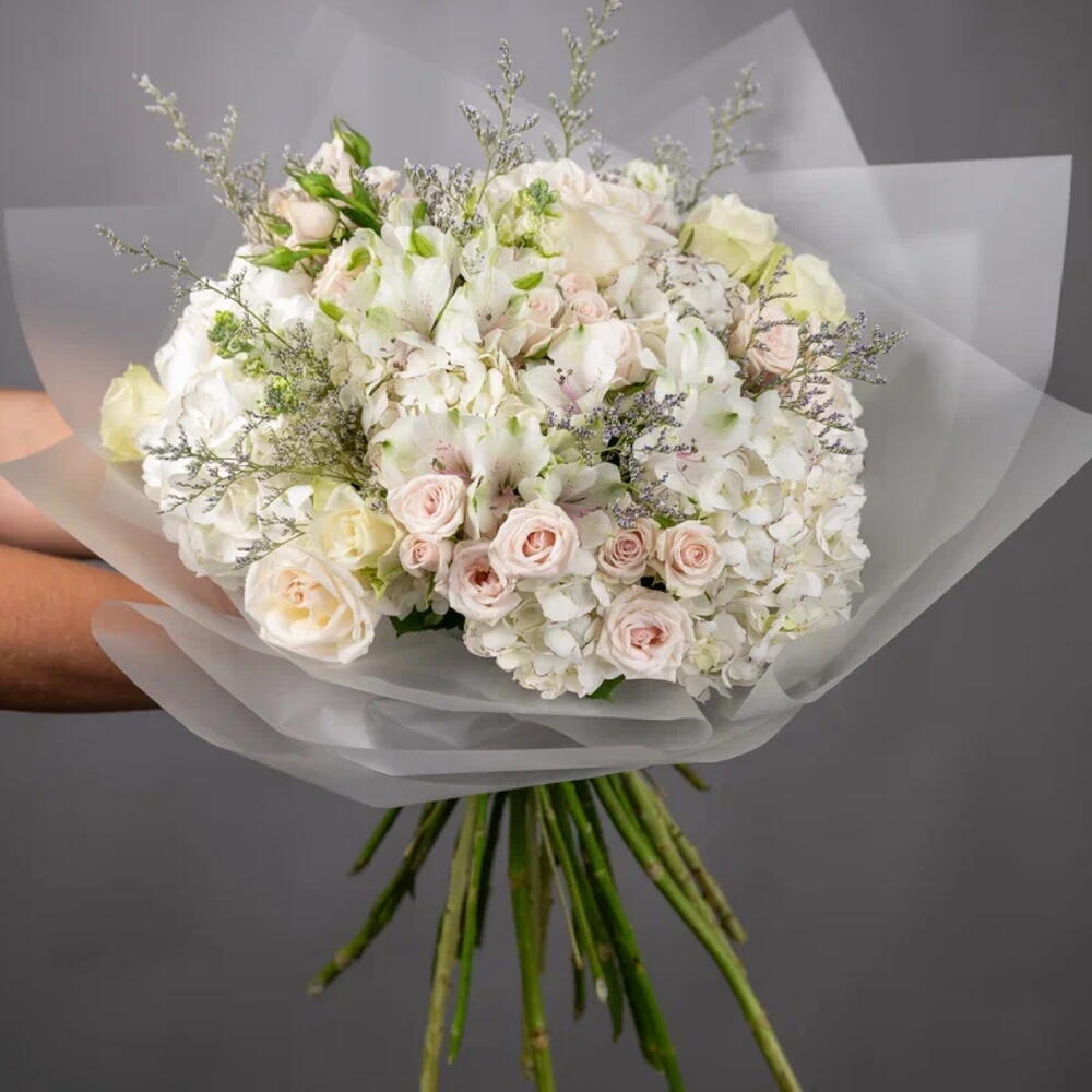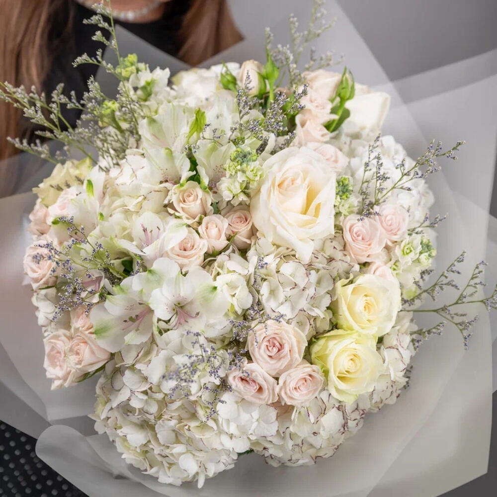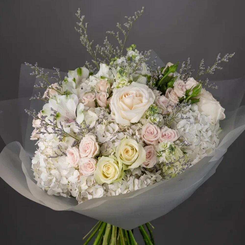 Alstroemeria - 4 pcs hydrangea white - 5 pcs matthiola - 3 pcs ohara rose - 3 pcs athena rose - 5 pcs porcelana spray rose - 7 pcs limonium purple - 4 pcs