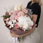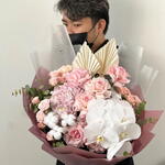 hydrangea pink - 3 pcs seasonal green - 1 pcs spray rose bombastic - 5 pcs accessories - 2 pcs ohara roses - 10 pcs orchids stems - 2 pcs