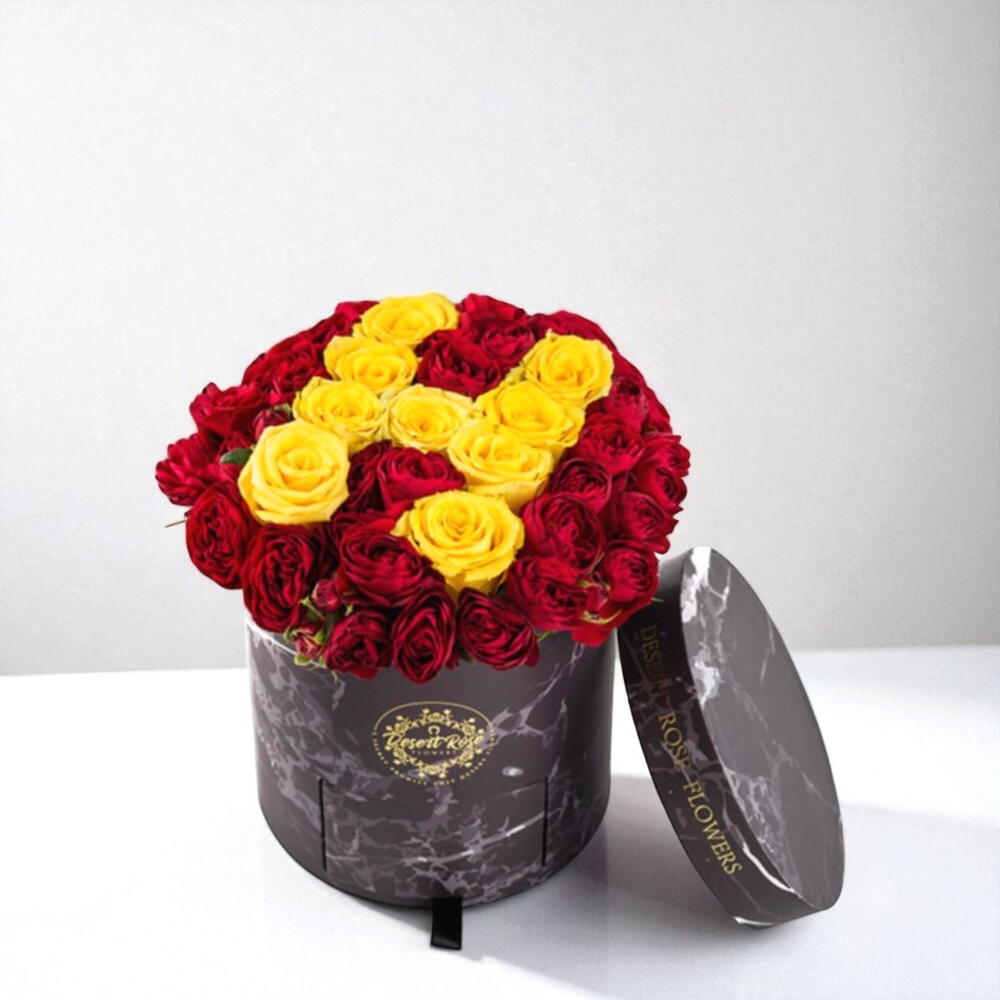 Make a bold statement with this luxurious round box arrangement featuring deep red and vibrant yellow roses in a stunning letter “H” formation. Perfect for birthdays, initials, or special personal gifts, this design combines timeless elegance with a creative twist. The arrangement comes in a sleek black marble hatbox, adding sophistication to your gesture. To prolong the freshness, keep flowers in a cool area, away from direct sunlight and drafts. Mist the roses lightly with water daily, and do not remove them from the floral foam inside the box.