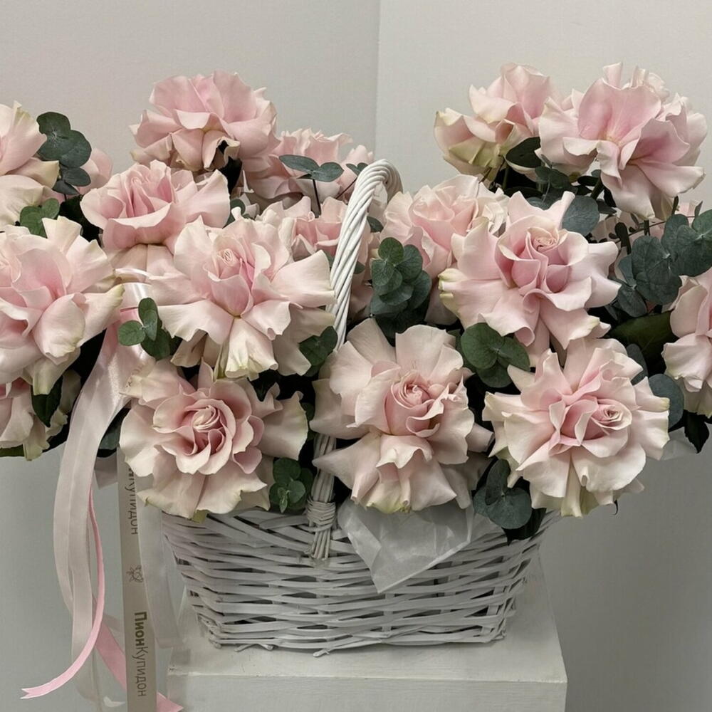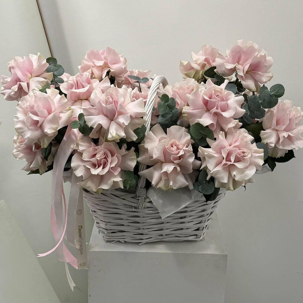 Treat yourself and your loved ones to a true work of art with our exclusive arrangement: large French roses radiating charm and romance, paired with delicate eucalyptus sprigs. This magnificent basket will be the perfect addition to any interior and will enhance any occasion.
