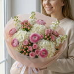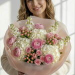 pink ranunculus - 6 pcs white hydrangeas - 3 pcs white matthiola - 3 pcs pink hypericum berries - 5 pcs pink spray roses - 6 pcs