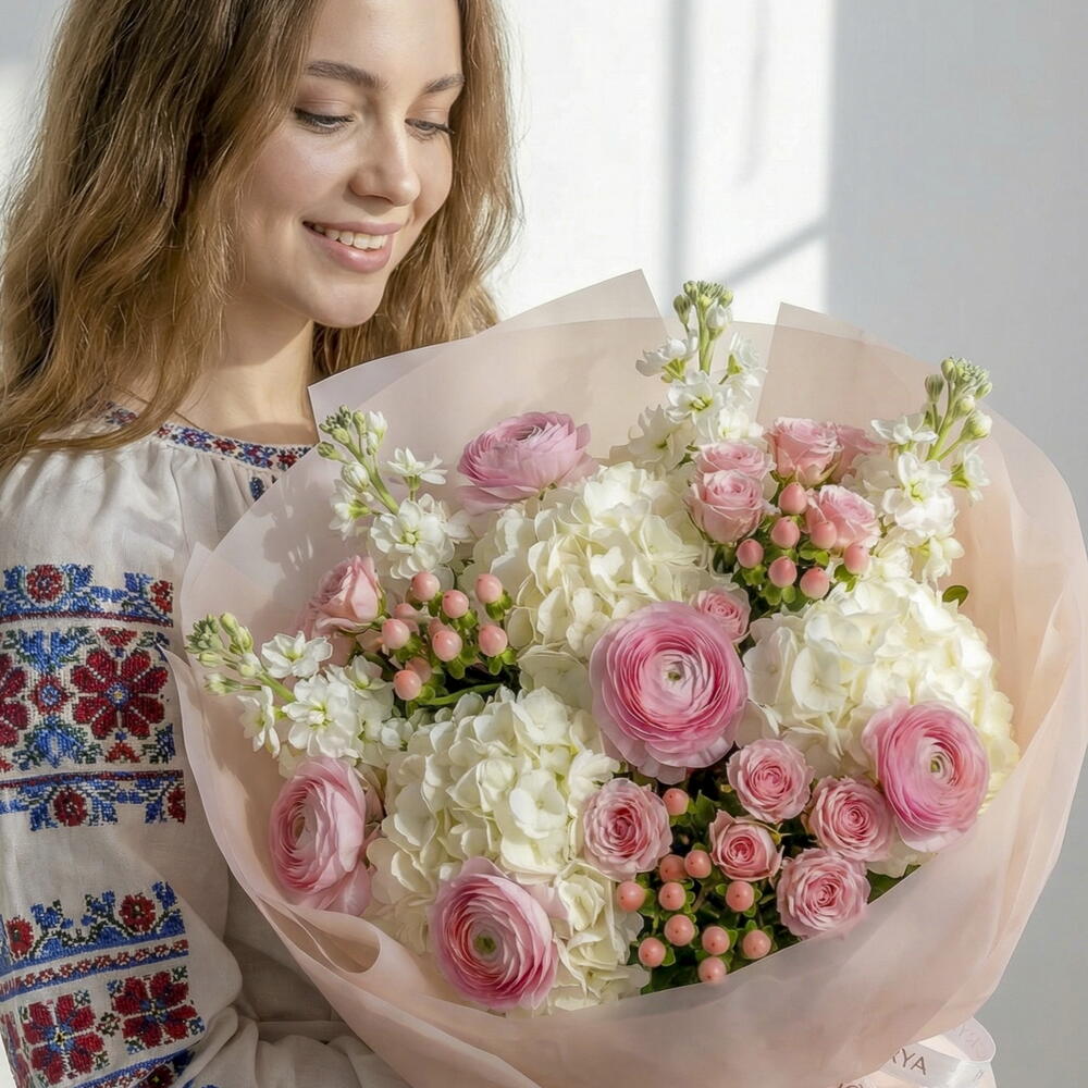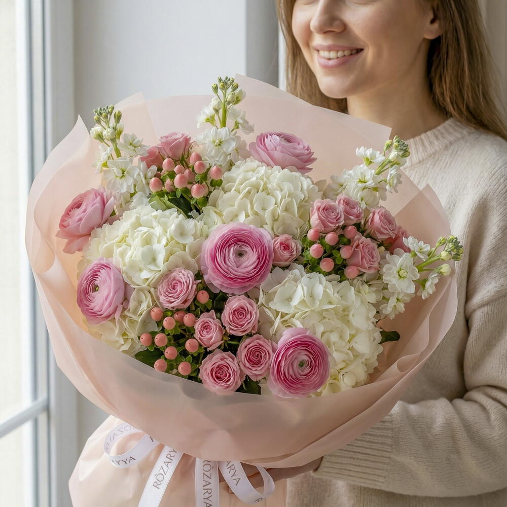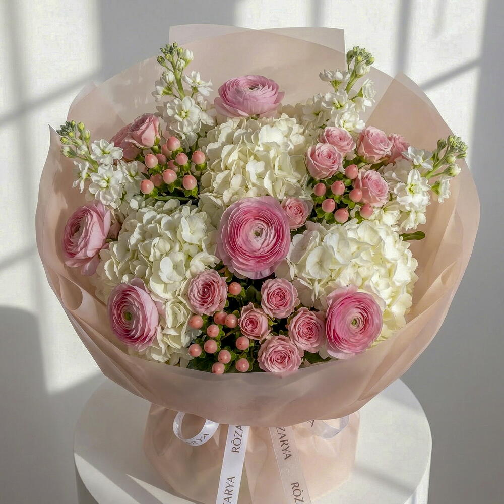 pink ranunculus - 6 pcs white hydrangeas - 3 pcs white matthiola - 3 pcs pink hypericum berries - 5 pcs pink spray roses - 6 pcs