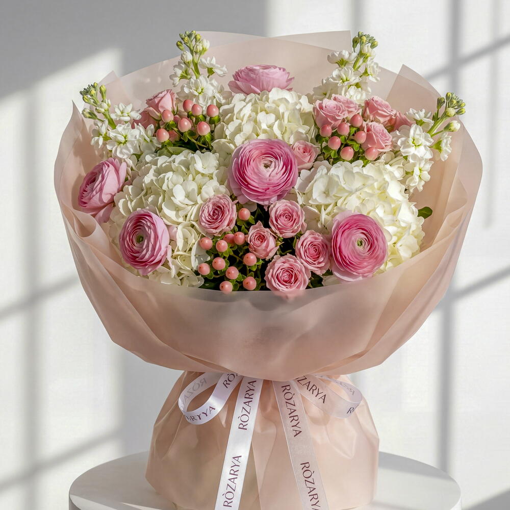 Elevate your gifting game with this masterfully textured arrangement. This isnt just a bouquet; it’s a designer piece from Rozarya Flowers that combines the ruffles of premium Ranunculus with the cloud-like softness of Hydrangeas.