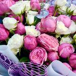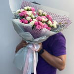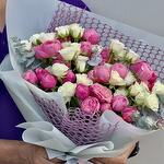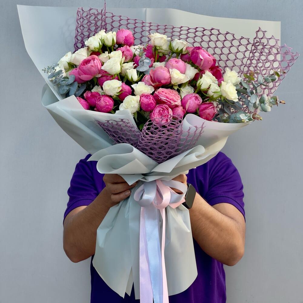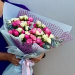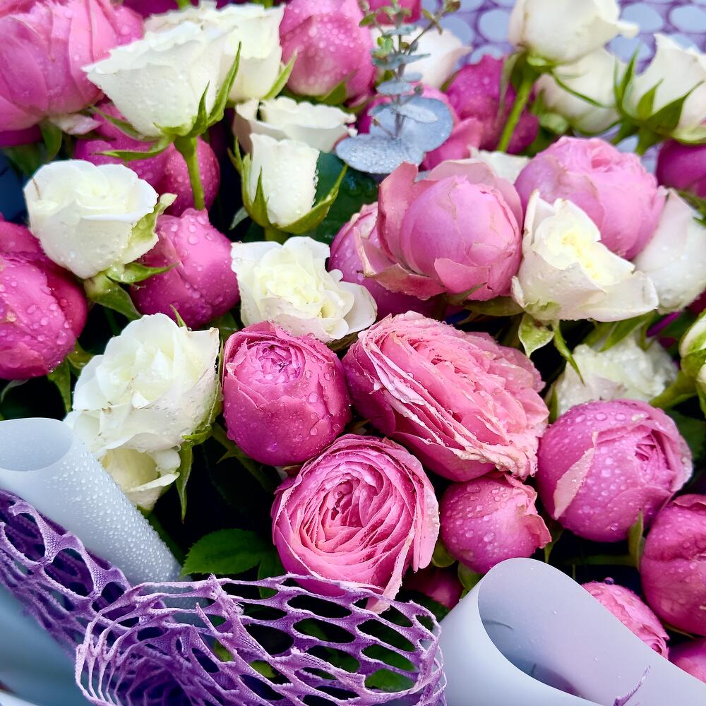 Ribbon - 1 pcs Wrapping - 6 pcs white baby rose - 11 pcs silva pink spray roses - 10 pcs