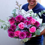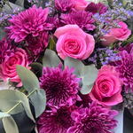 A mix of 4 stem maroon chrysthathium , 5 stem revival pink roses , 3 stem purple limonium , 2 stem jamaica leaves , 5 stem eucalyptus leaves with white wrapper.