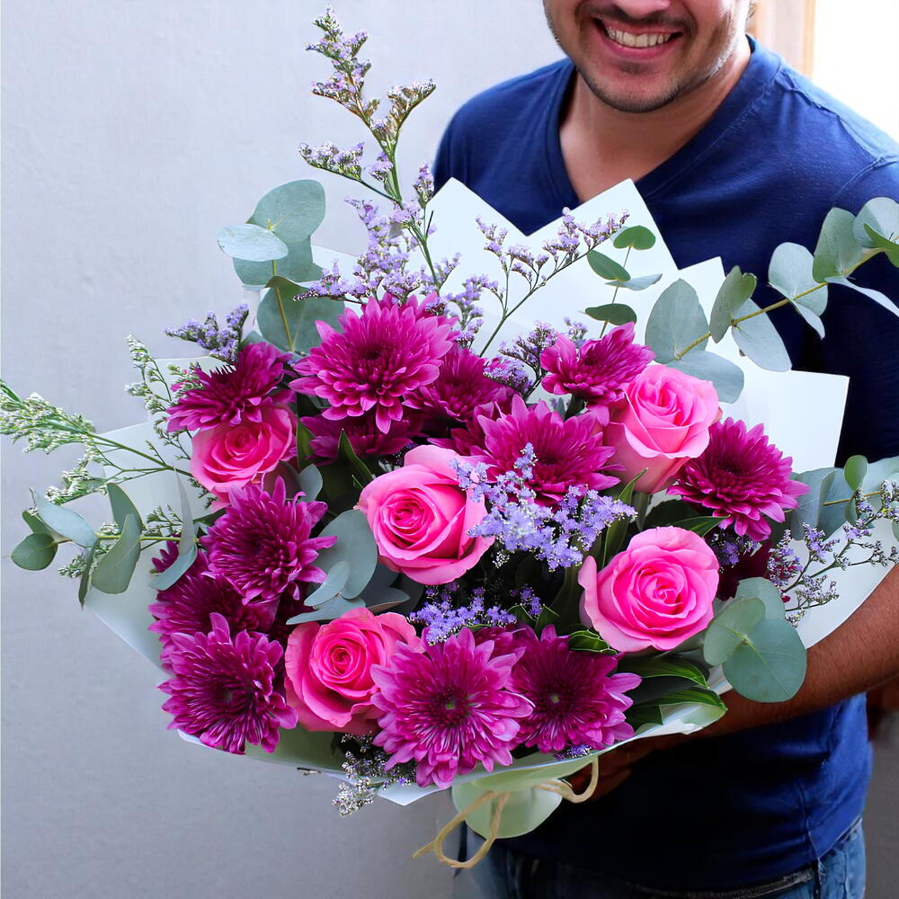 A mix of 4 stem maroon chrysthathium , 5 stem revival pink roses , 3 stem purple limonium , 2 stem jamaica leaves , 5 stem eucalyptus leaves with white wrapper.