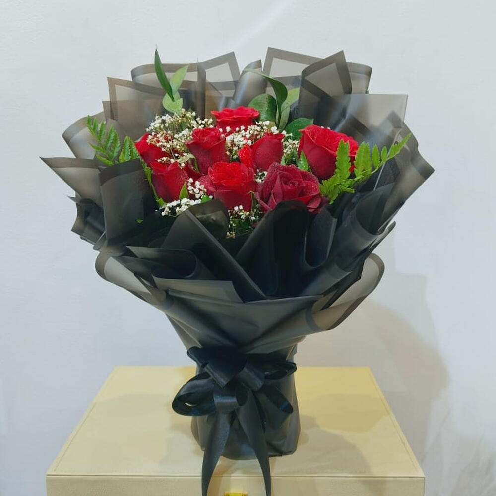 This stunning mono bouquet is composed of 10 exquisite red roses, intricately interwoven with 5 sprigs of delicate Gypsophila and accented with 5 lush green leaves. This arrangement is both romantic and ethereal, creating a striking balance between color and form. Its the perfect gift for expressing love, gratitude or congratulations.