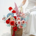 Express your affection with this exquisite Flowers in a Basket arrangement. This romantic assembly includes 7 inviting red roses, symbolizing an unspoken pledge of love. Adorned with 9 peony roses, known as the king of flowers, that proclaim opulence and magnificence. Complemented by the timeless beauty of 2 hydrangeas adding a splash of elegant charm. Furthermore, 3 anthuriums are added, hailing hints of tropics and 2 decorative palms, amplifying the aura of exotic mongering. To finish a refined composition are 5 asparagus fern stems that hint at the intricacies of love. This arrangement is sure to leave a lasting impression! Its more than just a bouquet; its a message of love and beauty. Dimensions Box + Flowers: Height 60 cm / Width 55 cm Dimensions Box: Height 30 cm / Width 23 cm