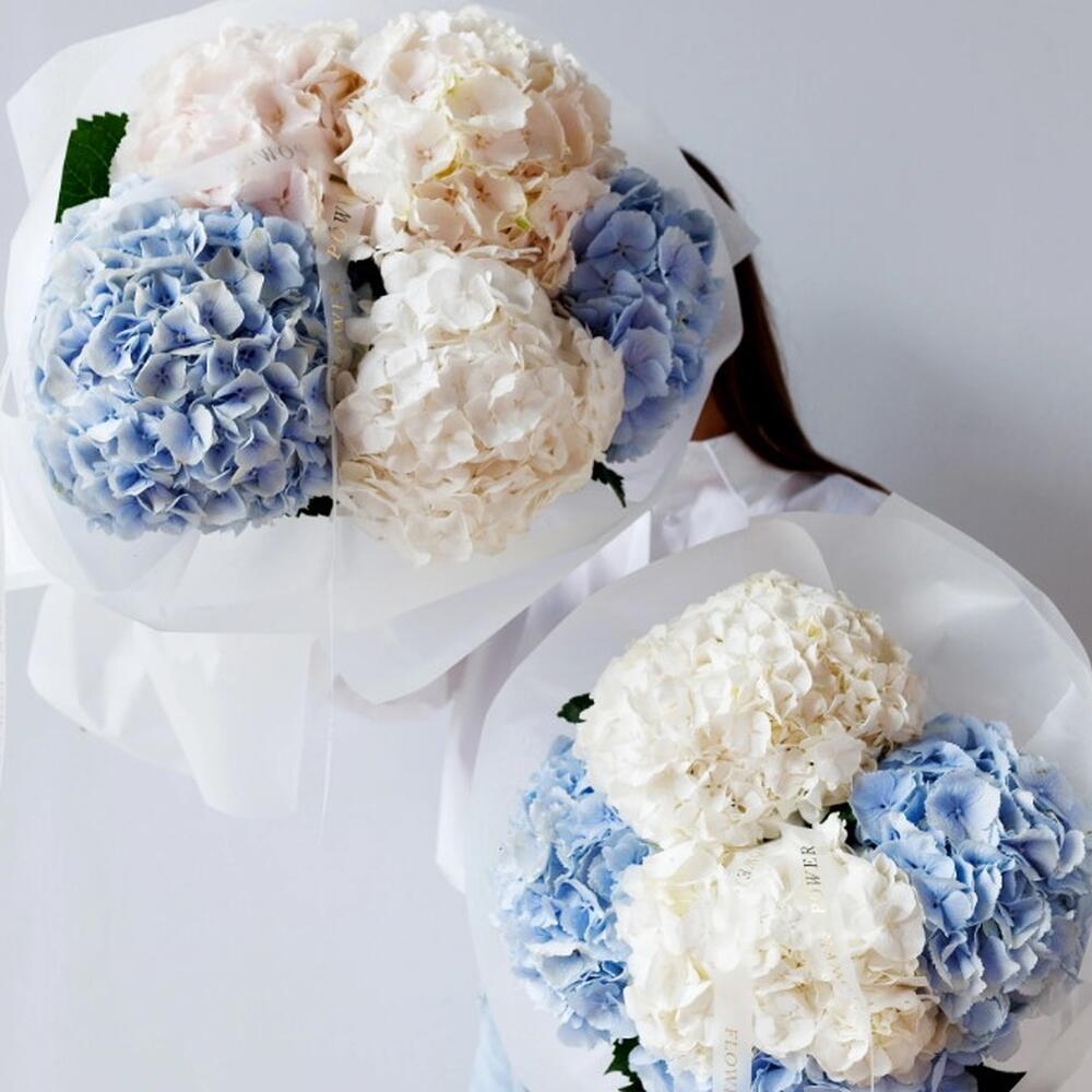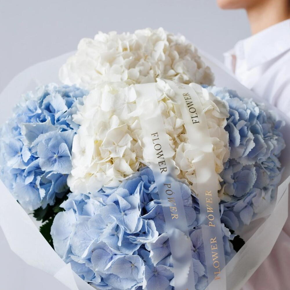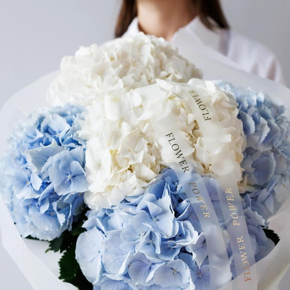 A striking and luxurious arrangement of premium blue and white hydrangeas, meticulously composed to create an airy, heavenly design. This Sky bouquet is the ultimate symbol of pure love and devotion—a stunning romantic gift perfect for expressing your feelings to a love interest, making a memorable first date impression, or simply as an eye-pleasing home decoration thanks to the hydrangeas longevity.