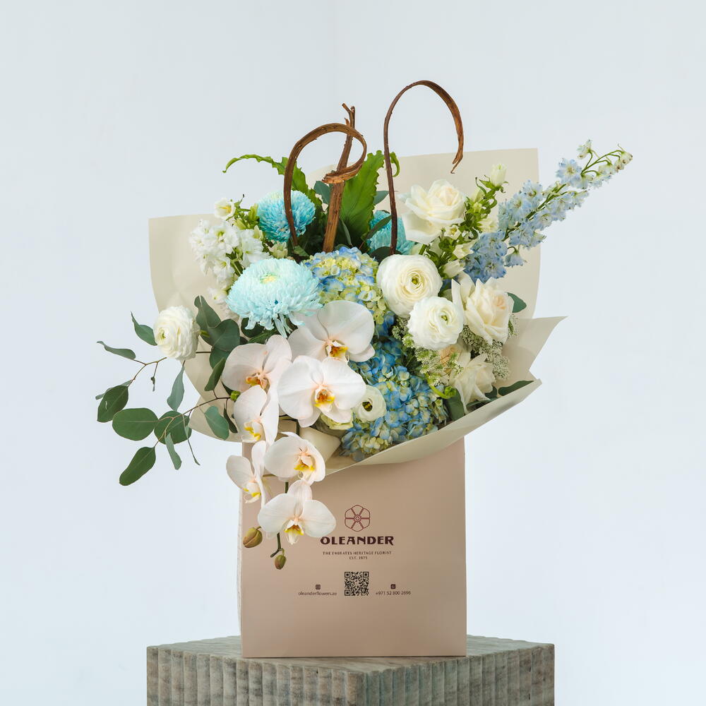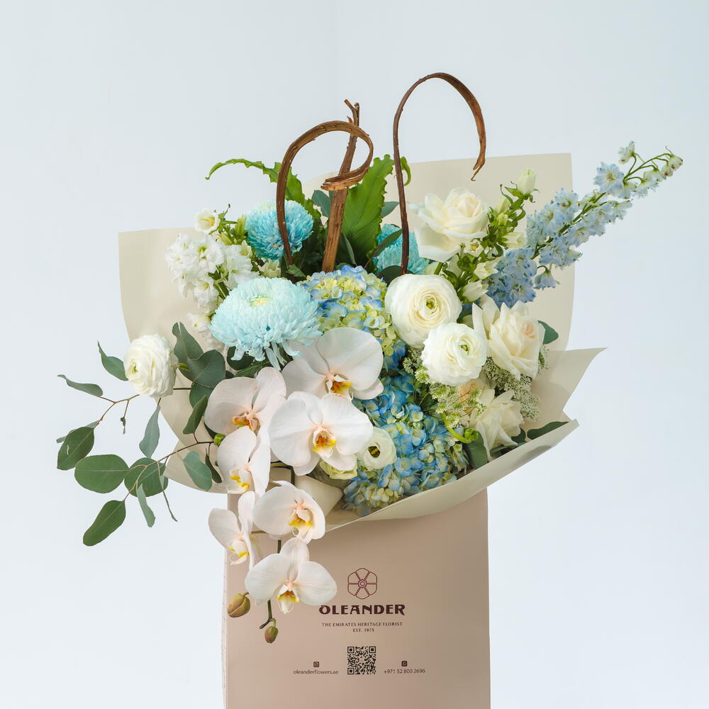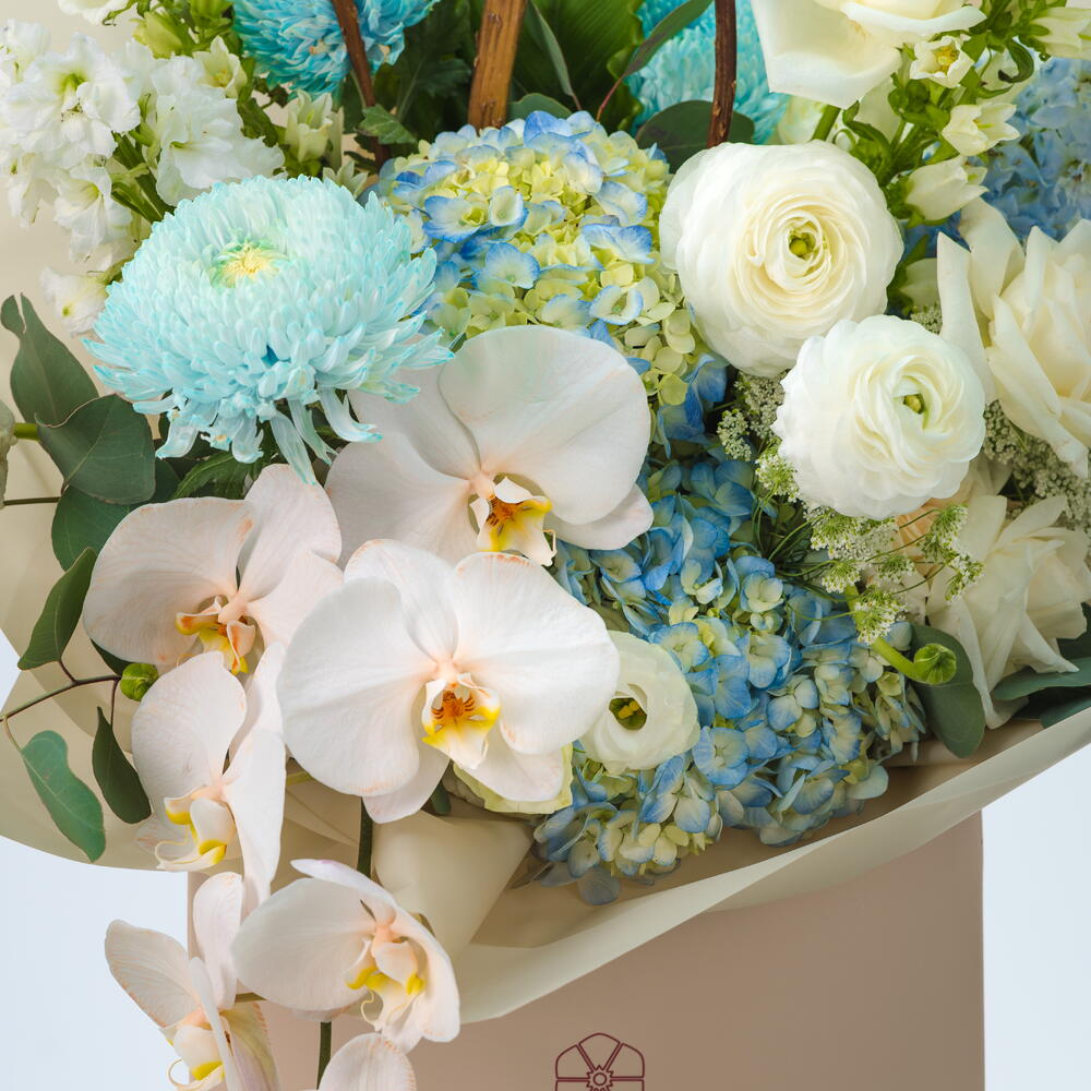 A striking arrangement of blue hydrangeas, orchid stems, delphiniums, tinted blue chrysanthemums, and white roses—capturing the serene beauty and elegance of a city skyline in bloom.