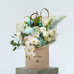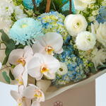 Lisianthus - 3 pcs Orchid - 1 pcs hydrangea blue - 3 pcs delphinium - 2 pcs ohara - 6 pcs chrysanth - 3 pcs rununculus - 3 pcs