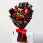 A striking one-sided bouquet of deep red roses, delicately paired with white gypsophila and wrapped in dramatic black paper—an unforgettable expression of passion and sophistication.