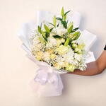 Elegant and timeless, this all-white bouquet is a graceful blend of purity and sophistication. Featuring creamy white roses, lilies, chrysanthemums, and delicate gypsophila, it creates a soft and serene composition perfect for weddings, anniversaries, sympathy gestures, or minimalist home decor. Wrapped in crisp white film and tied with a satin ribbon, this bouquet radiates understated luxury. To maintain its fresh beauty, place the bouquet in clean, cool water and trim the stems diagonally every 2–3 days. Keep it away from direct sunlight, heat, and cold drafts. Change the water regularly and remove any fading blooms to preserve its refined and elegant look.