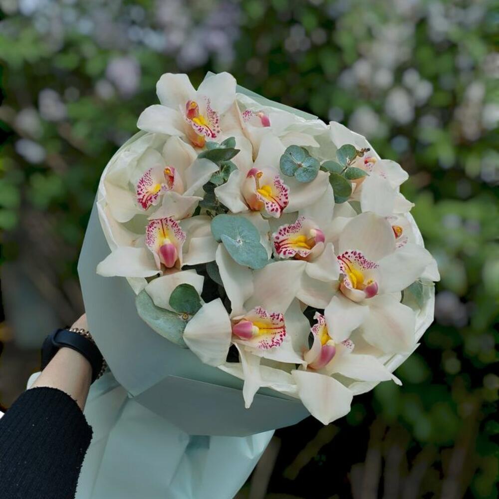 A luxurious arrangement of vibrant white Cymbidium orchids, symbolizing love, strength, and beauty. The unique style bouquet adds a modern, stylish touch—perfect for romantic occasions, thank-you gifts, or upscale celebrations.