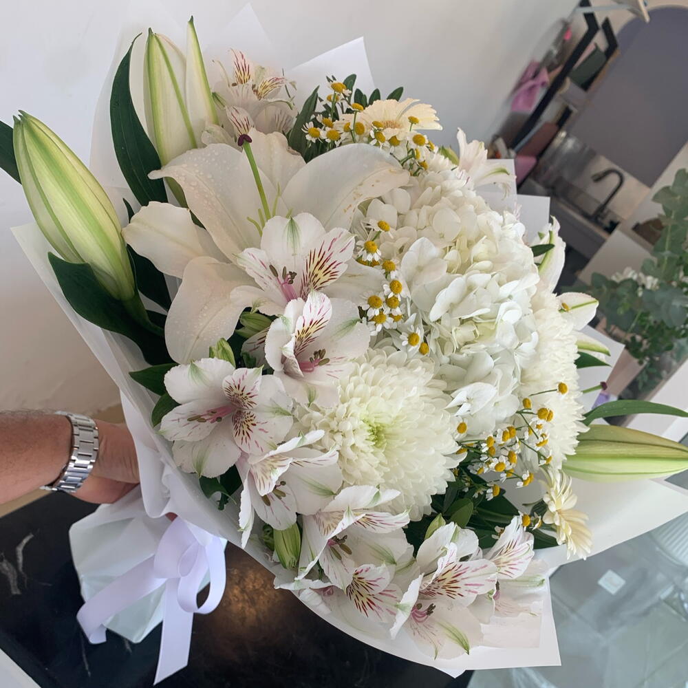 Alstroemeria - 4 pcs daisies - 4 pcs gerbera mini - 3 pcs hydrangea white - 1 pcs lilly - 2 pcs