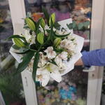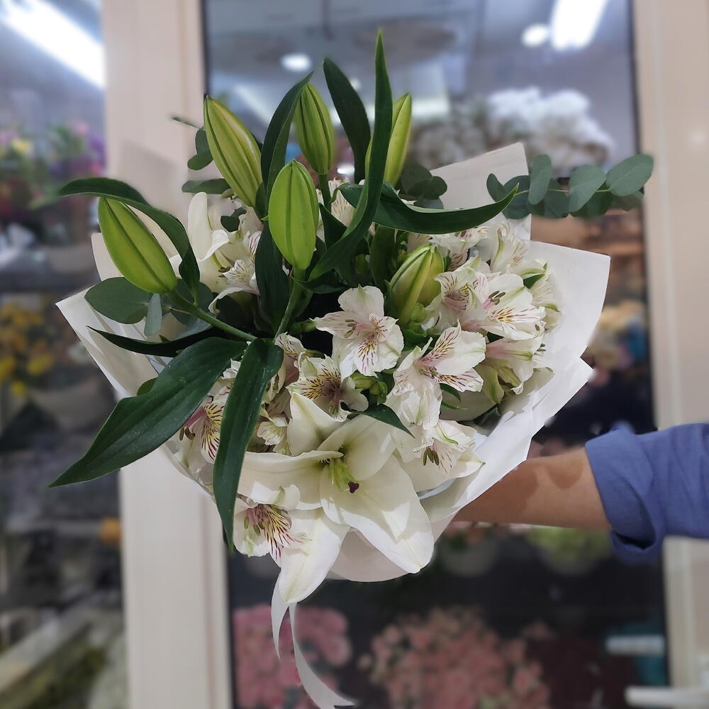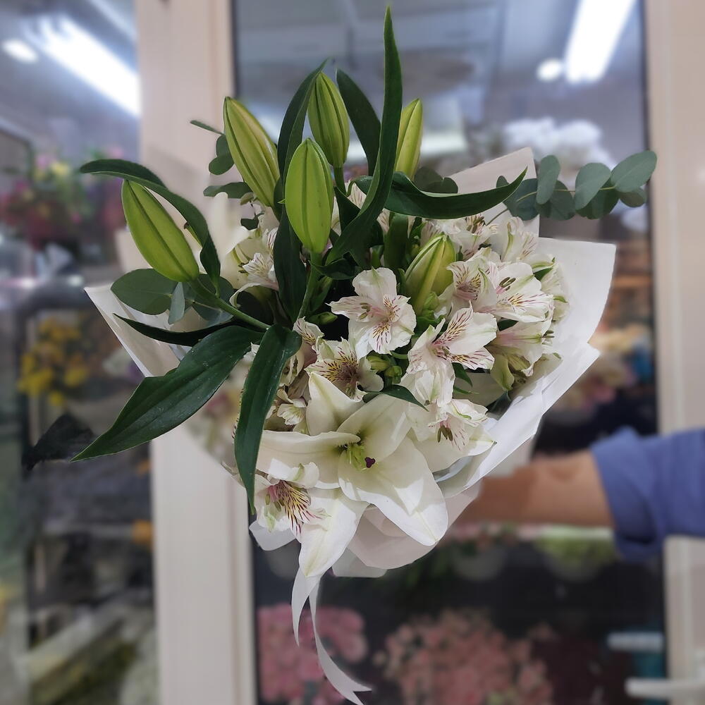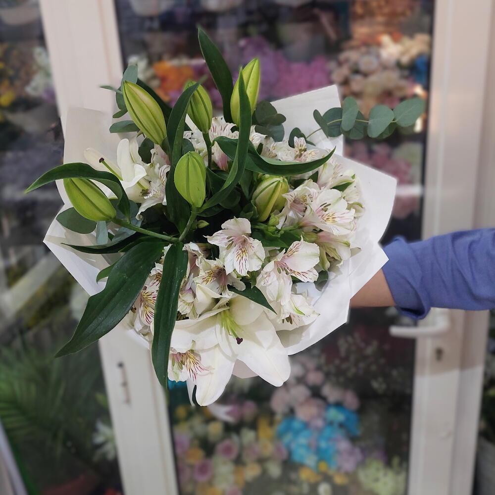 White lilies - 3 pcs white alstroemeria - 7 pcs eucalyptus leaves - 3 pcs full white wrapping sheets - 4 pcs