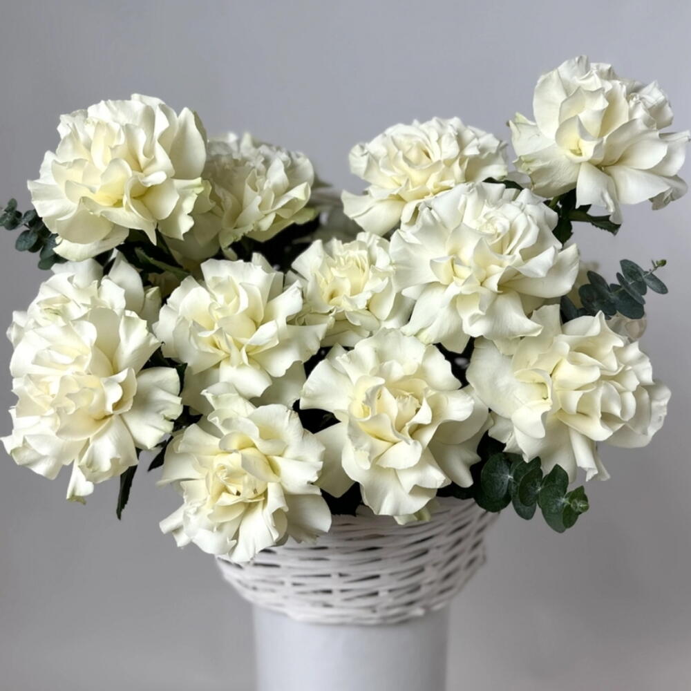 Eucalyptus - 8 pcs Basket - 1 pcs white classic roses - 51 pcs