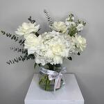 Eucalyptus - 1 pcs rose white - 5 pcs hydrangea white - 1 pcs matthiola white - 1 pcs clear glass vase - 1 pcs