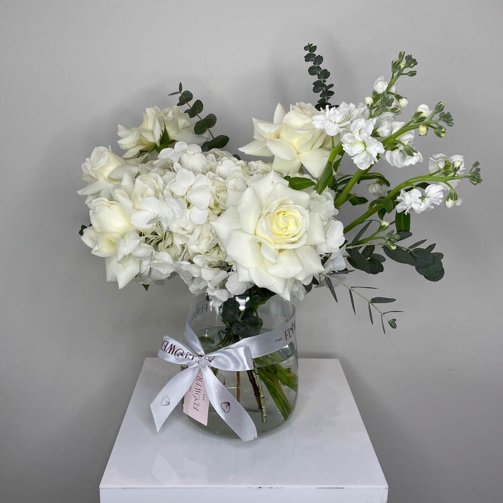 Eucalyptus - 1 pcs rose white - 5 pcs hydrangea white - 1 pcs matthiola white - 1 pcs clear glass vase - 1 pcs