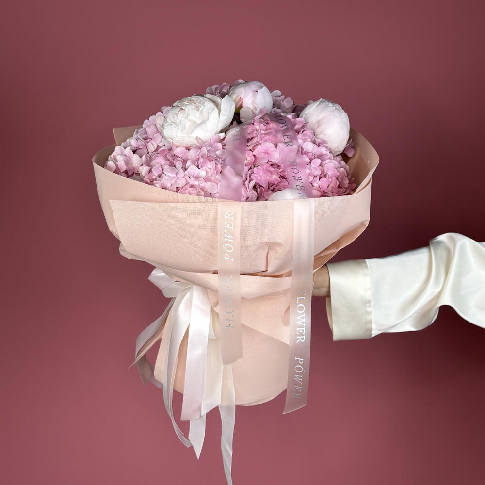 A bouquet full of soft beauty and delicate charm. Combining fluffy hydrangeas and luxurious peonies, this arrangement speaks in the language of tenderness. Perfect for a birthday, a romantic surprise, or simply to say: “You are beautiful.”