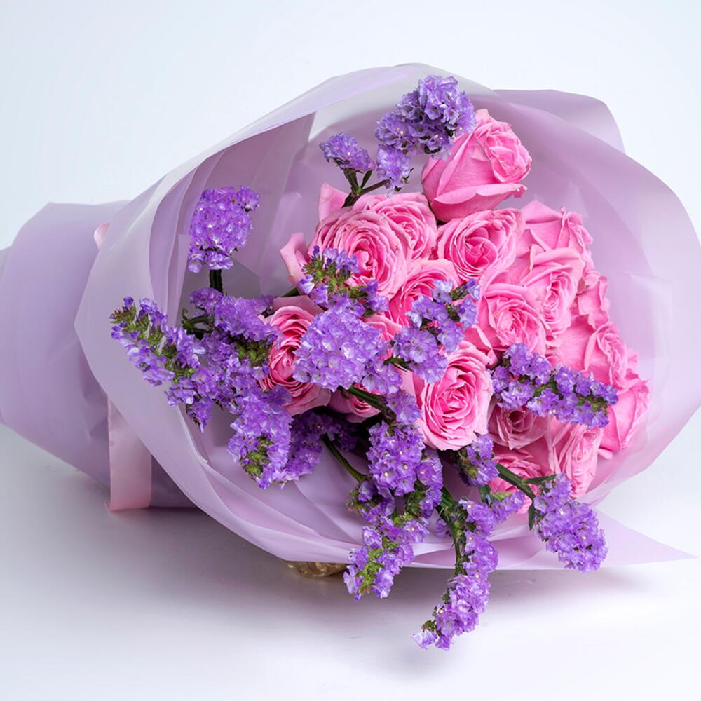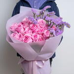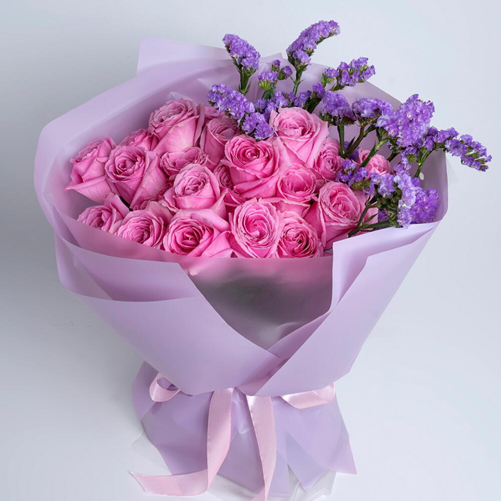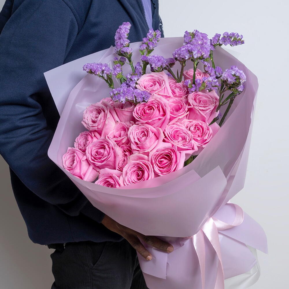 Bouquet of 21 pink roses and statice