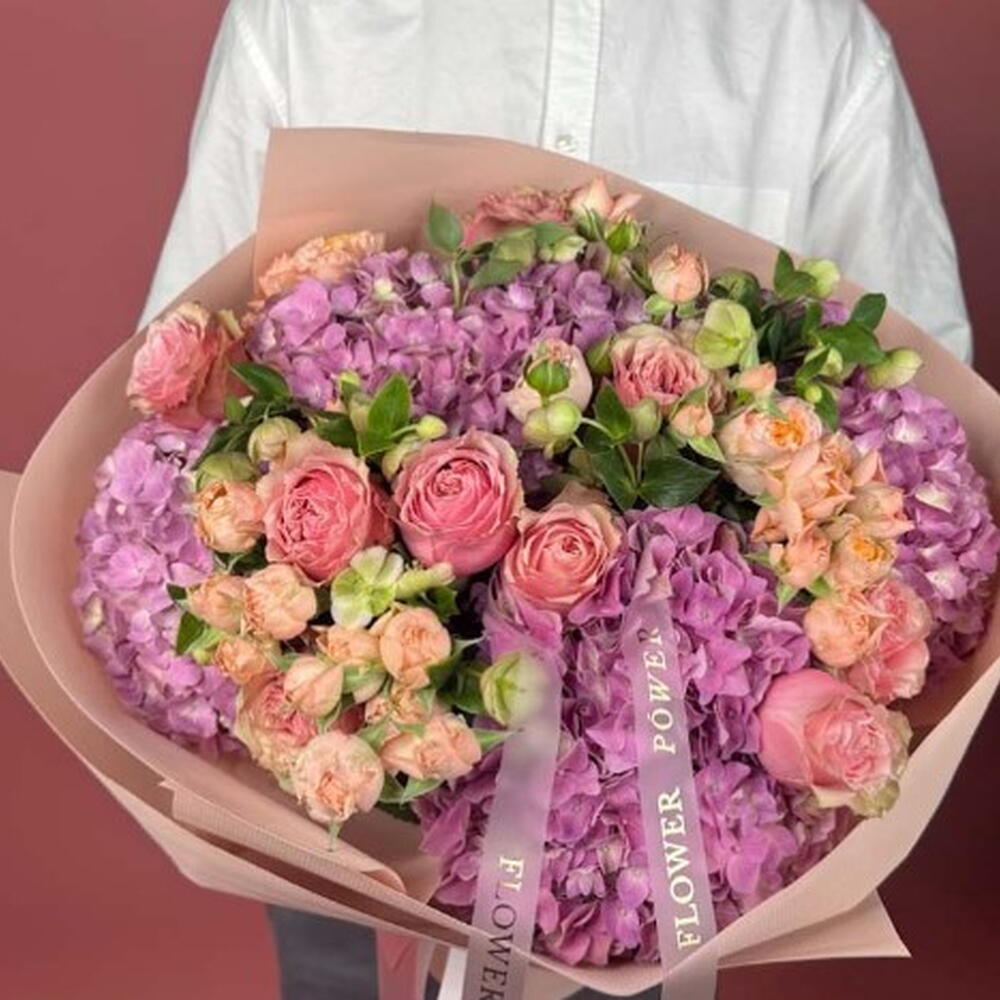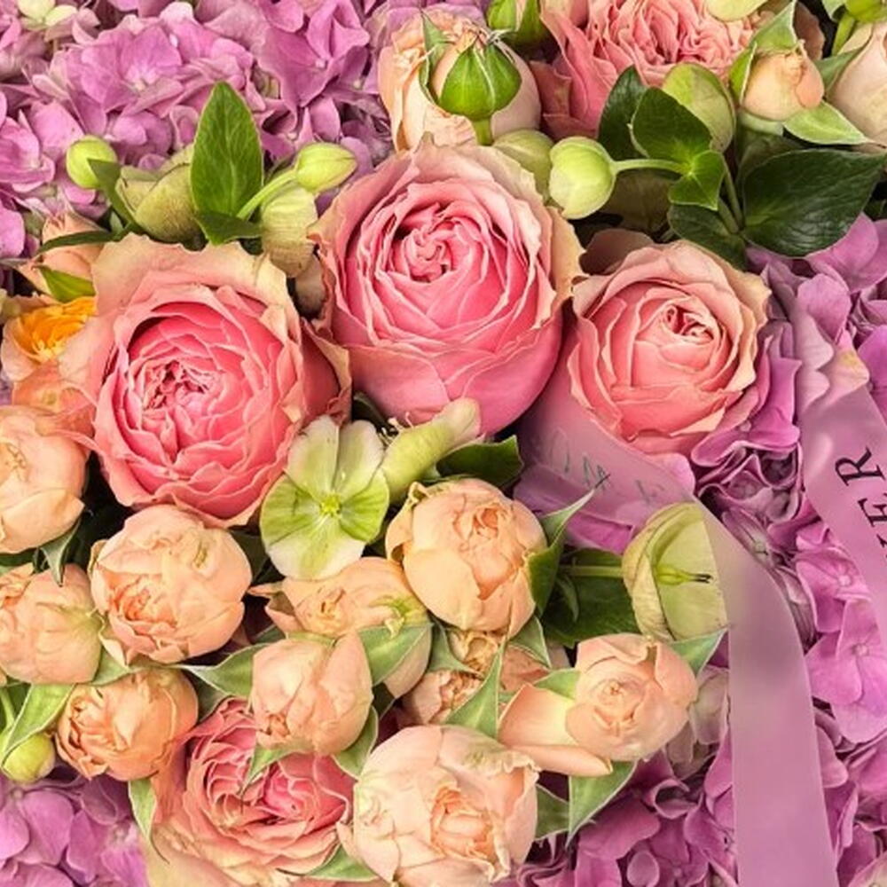 A soft and romantic bouquet featuring stunning hydrangeas, elegant roses, delicate spray roses, and charming helleborus blooms. A gentle mix perfect for expressing warmth and sincere admiration.