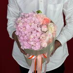 A delightful and tender small bouquet featuring a beautiful blend of soft pink Hydrangeas, Roses, Spray Roses, and Eustomas. This arrangement is the essence of gentle affection, admiration, and grace—a charming and thoughtful just because gift or a sweet gesture for birthdays and get-well wishes.