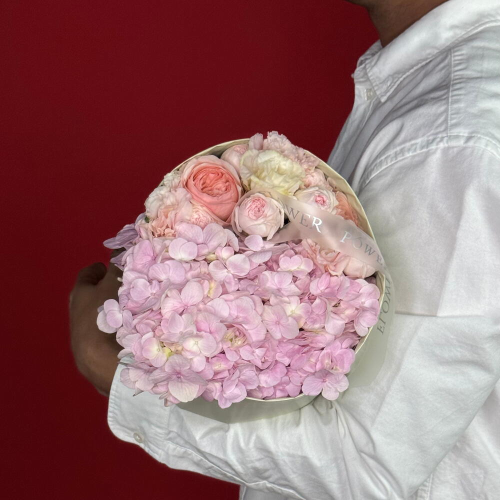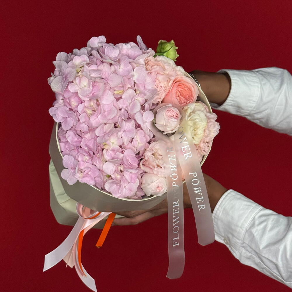 A delightful and tender small bouquet featuring a beautiful blend of soft pink Hydrangeas, Roses, Spray Roses, and Eustomas. This arrangement is the essence of gentle affection, admiration, and grace—a charming and thoughtful just because gift or a sweet gesture for birthdays and get-well wishes.