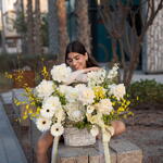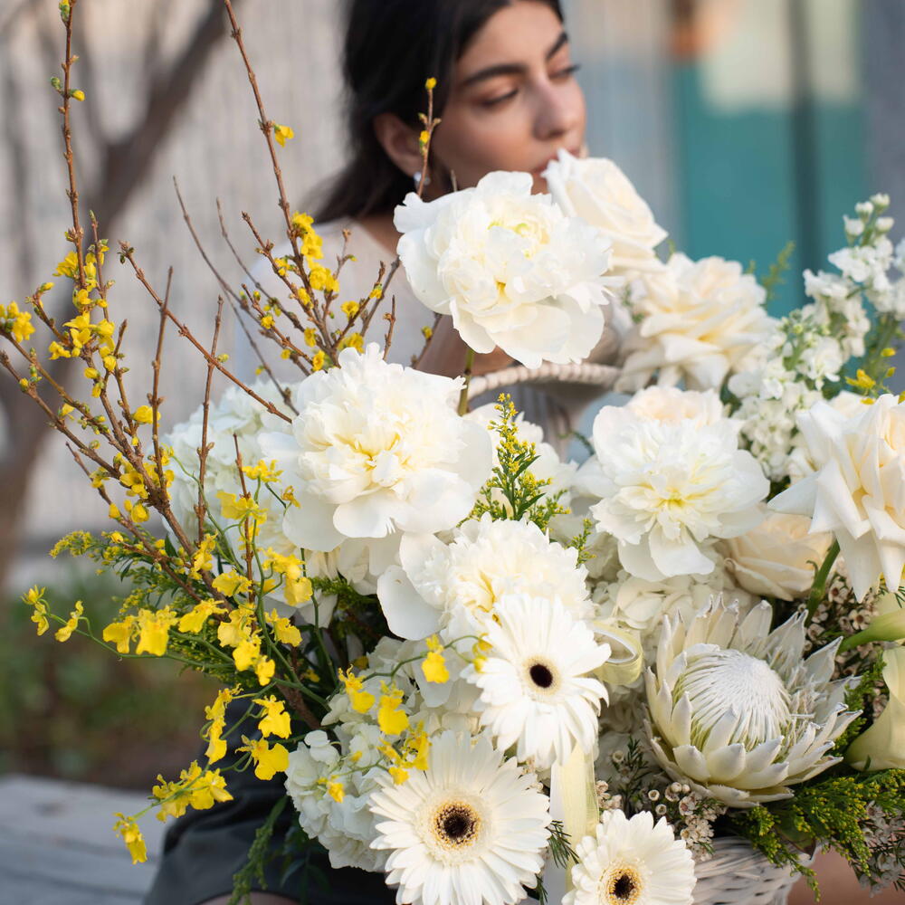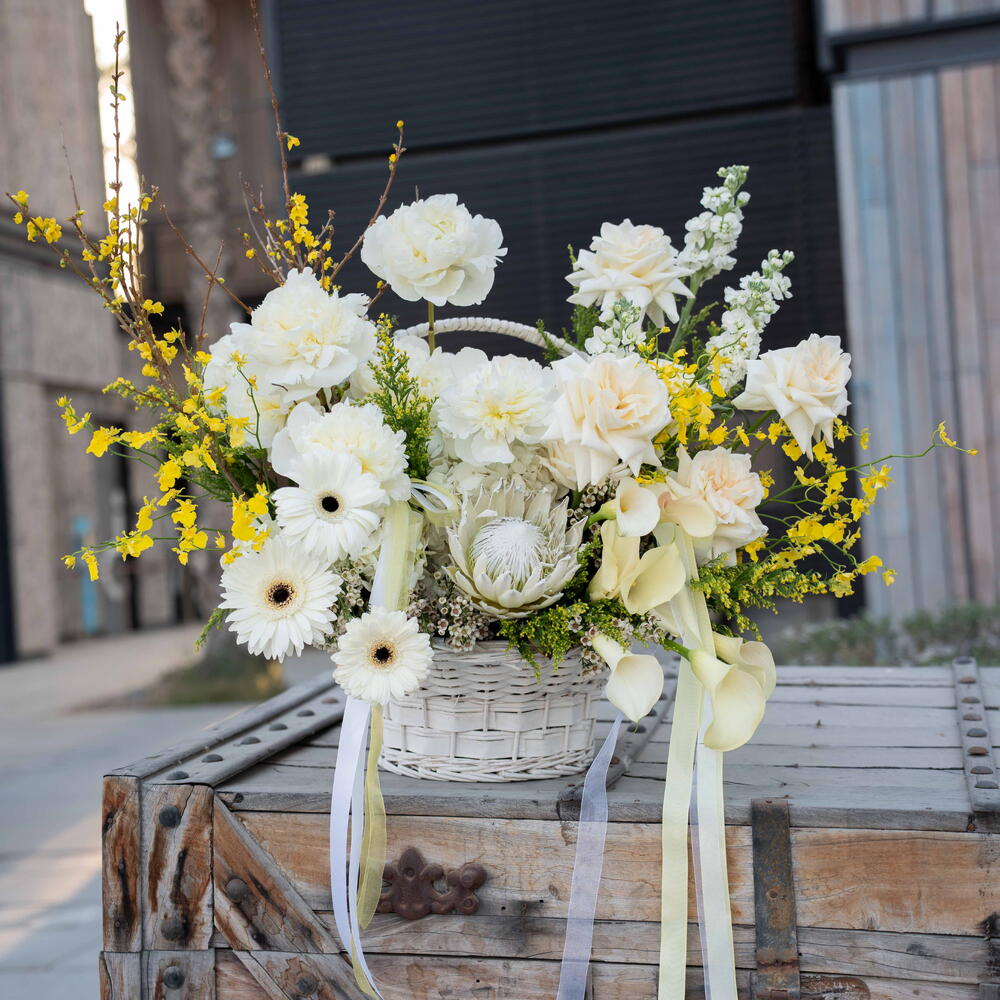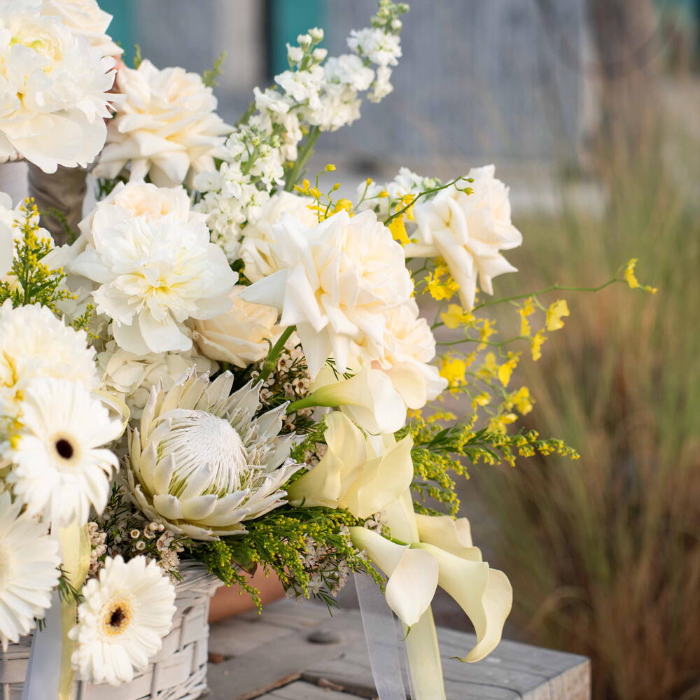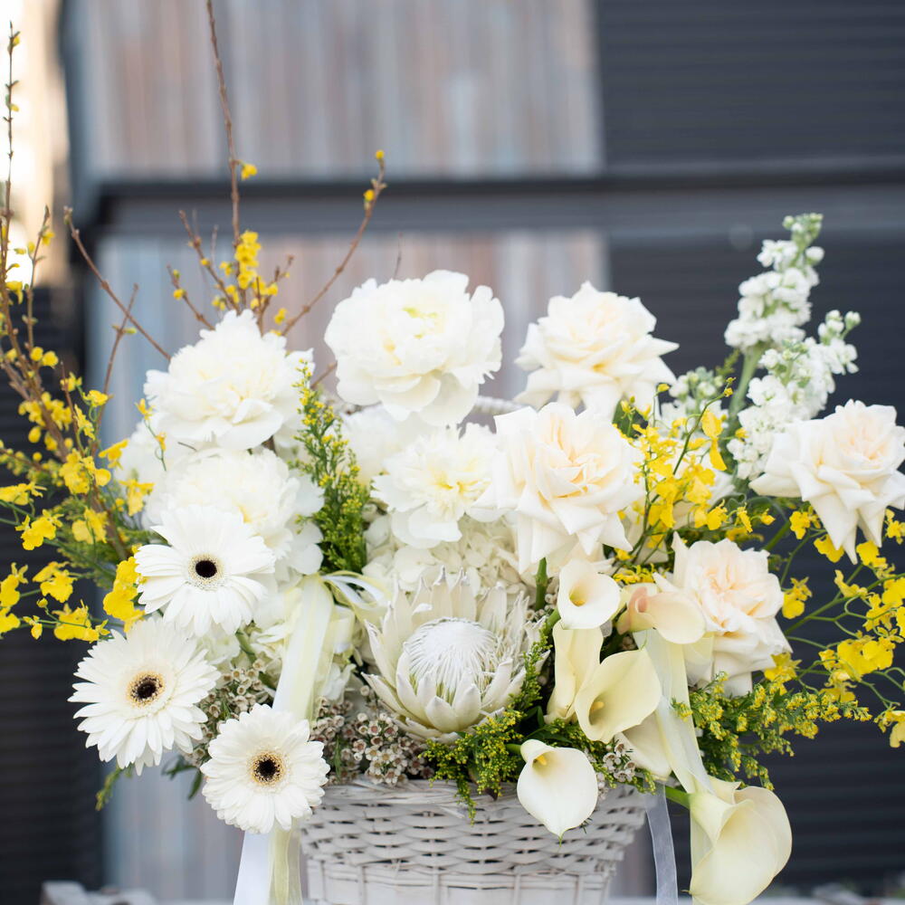 Solidago - 10 pcs hydrangea white - 3 pcs calla lily white - 8 pcs peonies white - 5 pcs gerbera white - 3 pcs matthiola white - 3 pcs wax white - 2 pcs ohara white - 8 pcs basket white - 1 pcs oncidium yellow - 4 pcs protea white - 1 pcs forysthia - 2 pcs