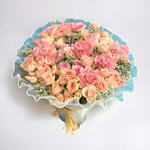 Immerse in the intense floral fantasy of our special florists bouquet, composed of 10 vibrant carnations and 10 petite spray roses. With an addition of 5 limoniums, it creates an irresistible allure, subtly wrapped in a stylish net and complemented with a sweet personalized card. Its not only a bouquet, its a masterpiece that conveys your deepest sentiments.