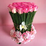 Orchid - 1 pcs card - 1 pcs steel grass - 5 pcs roses - 20 pcs spray roses - 5 pcs hydrengias - 2 pcs