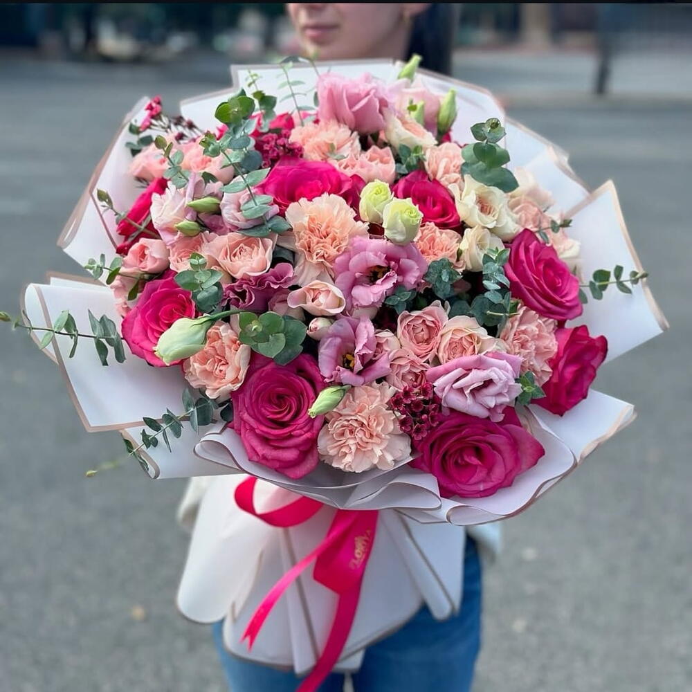 Eucalyptus - 5 pcs Wrapping - 10 pcs carnations - 17 pcs card - 1 pcs stoma - 6 pcs roses - 10 pcs