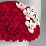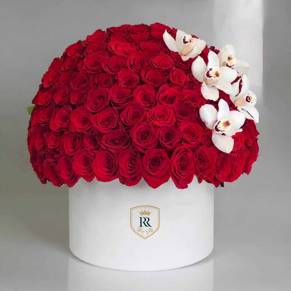 From the velvety petals to the delicate fragrance, every detail of this 150 rose arrangement exudes luxury. Expertly arranged in a sophisticated box, this gift is a testament to refined taste and timeless beauty with cymbidiums touch.