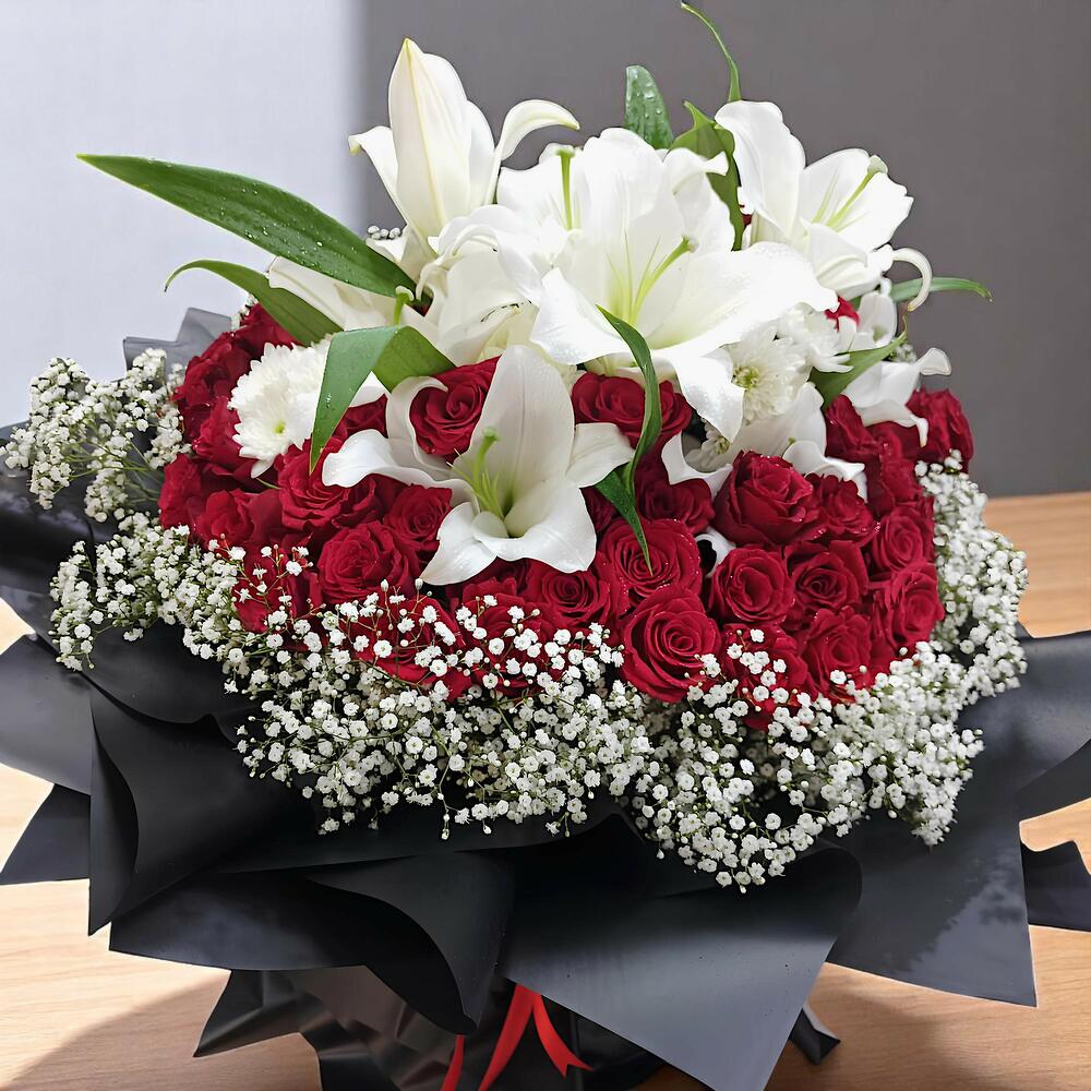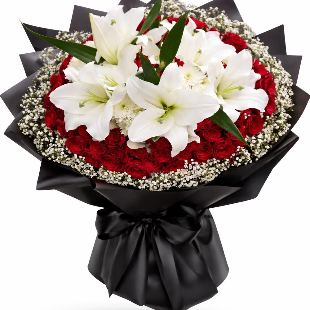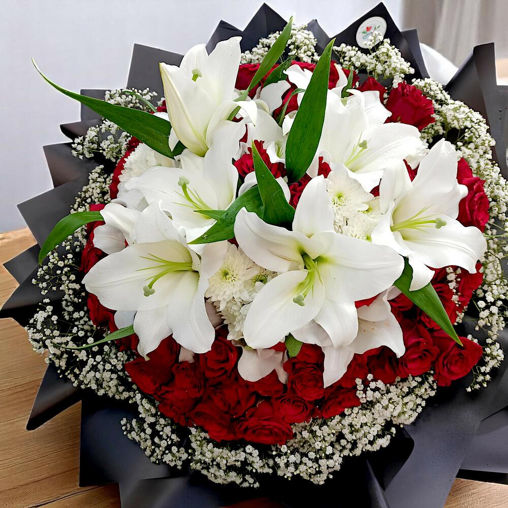 Red rose - 85 pcs Lily - 5 pcs crisantemum - 5 pcs