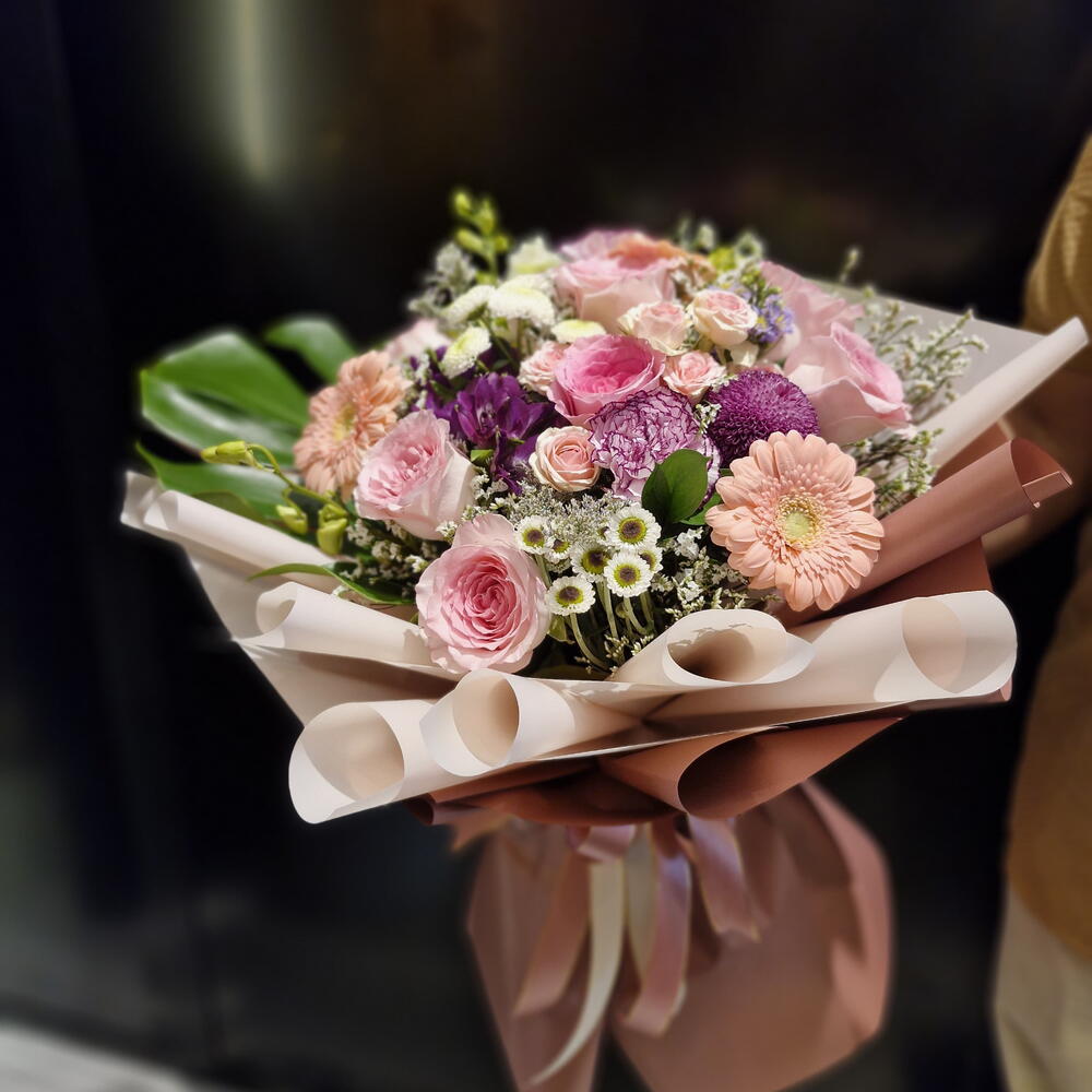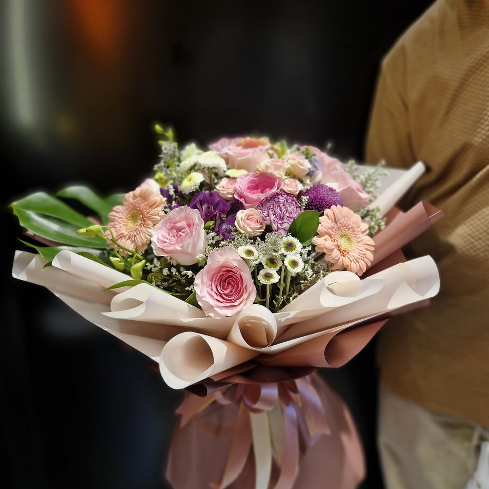 Eustoma - 2 pcs Pink rose - 5 pcs daisy - 3 pcs purple chrysanthemum - 2 pcs ruscus leaves - 3 pcs gypso - 3 pcs peach daisy - 2 pcs