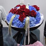 blue hydrangea - 10 pcs black wrapping - 6 pcs red equcdor rose - 11 pcs white soft paper - 4 pcs ribbon stylish - 3 pcs