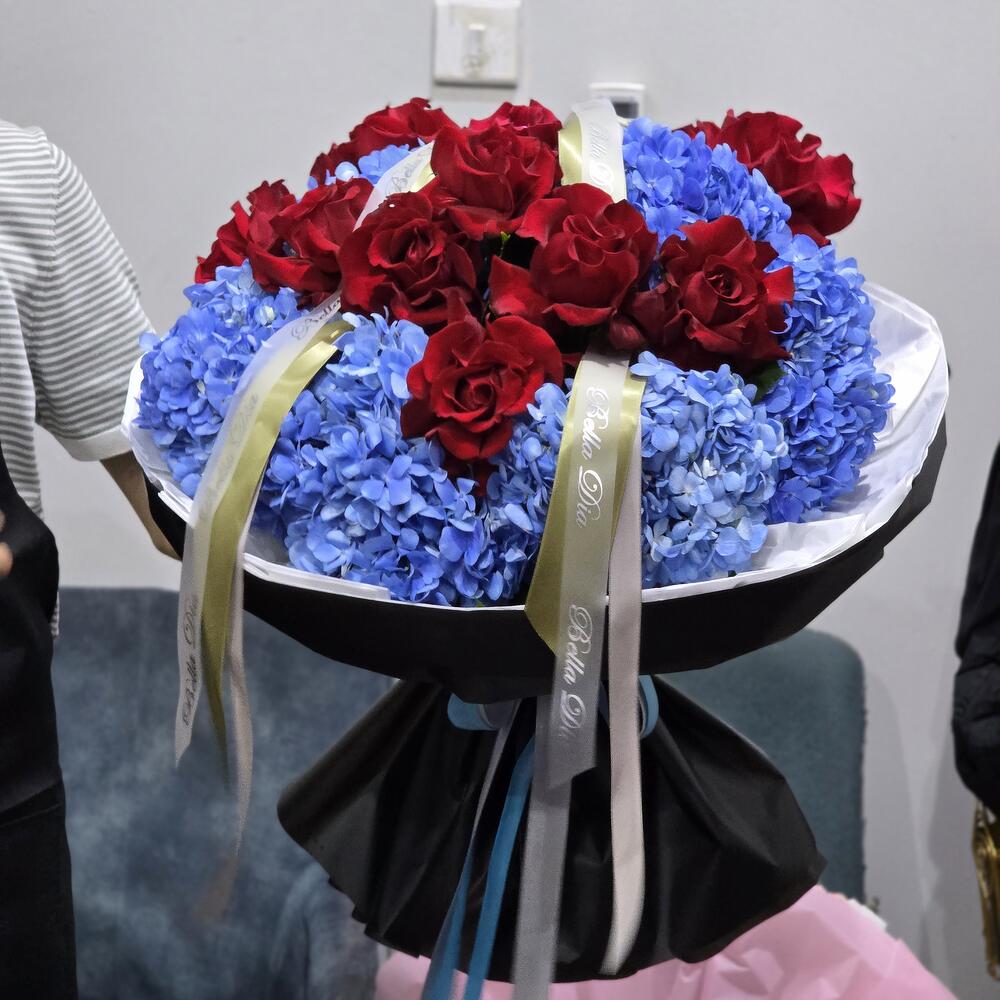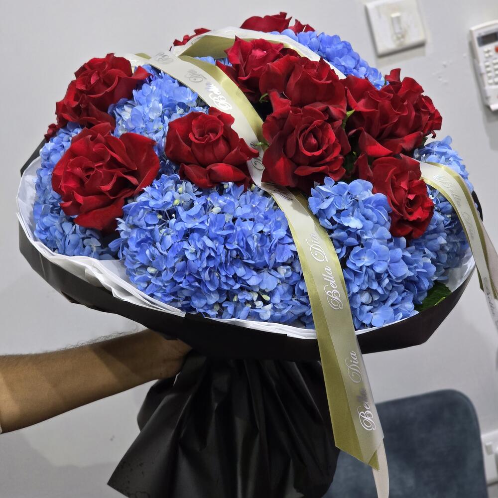 Here’s a sales-focused version for you: Best-Selling Luxury Rose Hydrangea Bouquet Turn heads with this premium bouquet featuring 12 vibrant red roses surrounded by 11 lush blue hydrangeas—a breathtaking contrast that speaks elegance and love. Wrapped in high-end black paper and finished with luxury satin ribbons, this arrangement is perfect for anniversaries, birthdays, or any moment you want to make unforgettable. Fresh. Bold. Unmissable. Limited availability – order now for same-day delivery in Dubai!