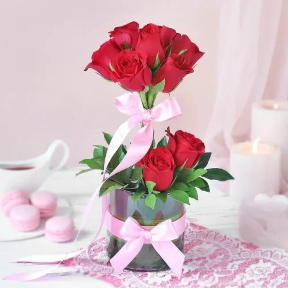 "Gift Contains : 10 Red Rose 1-2 stems eucalyptus parvifolia leaves 1-2 stems massangeana leaves Cylinder Glass Vase 10x10 cm Seasonal fillers Note: The product images has displayed is only indicative in nature, but we put our 100% efforts to match the image displayed, the actual product delivered may vary in shape or design as per the availability."