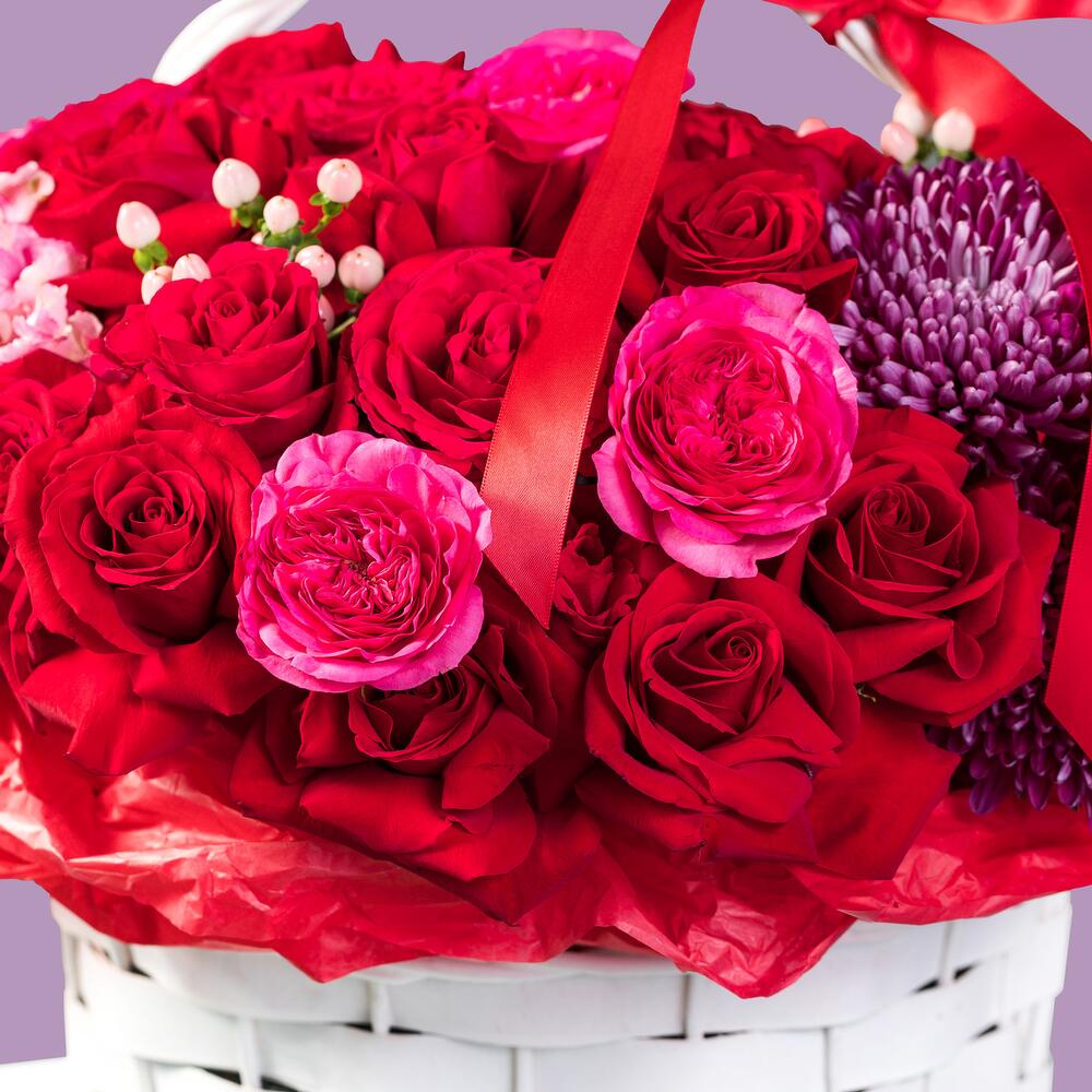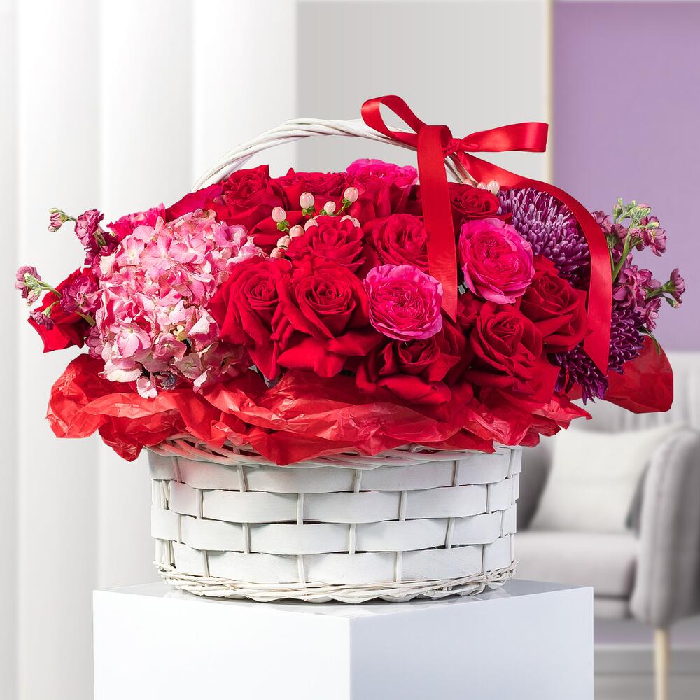 Basket bursting with the beauty of red roses, Juliet pink roses, pink hydrangeas, and pink matthiola. This enchanting arrangement combines rich crimson tones with delicate blush hues, creating a captivating display of romance and elegance. Perfect for expressing love or admiration on any occasion.