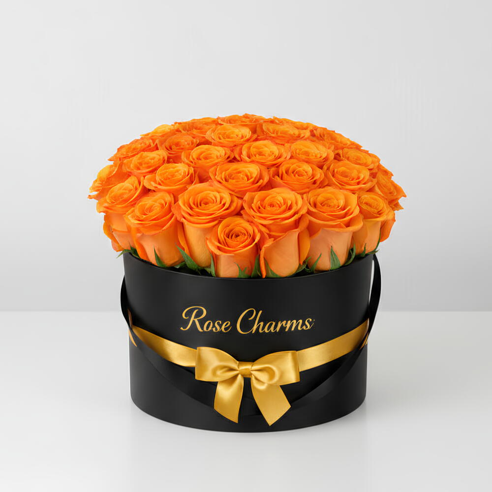 A bold expression of warmth, passion, and radiant energy. This stunning arrangement features premium fresh orange roses, carefully arranged in a sleek black luxury hat box, finished with a rich golden satin ribbon and elegant Rose Charms branding. The vibrant orange tones symbolize enthusiasm, admiration, and deep desire — making it a powerful gift that stands out instantly. Orange roses represent: Passion with warmth Energy and confidence Admiration and pride Celebration of success Perfect for: Birthday surprises Romantic gestures Congratulations gifts Corporate luxury gifting Festive occasions Each bloom is hand-selected for fullness and color intensity, ensuring a bright, eye-catching presentation that commands attention the moment it arrives. ✨ Premium fresh roses ✨ Signature black hat box ✨ Elegant golden ribbon finish ✨ Luxury presentation ready to gift When you want something vibrant, confident, and unforgettable — this is the box that speaks.