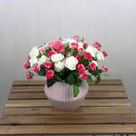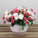 A dazzling arrangement of white spray roses paired with vibrant Fireworks spray roses, beautifully displayed in a sleek ceramic vase. The serene white blooms symbolize purity and grace, while the colorful Fireworks roses add a burst of energy and charm. Together, they create a stunning visual contrast, perfect for brightening any occasion. This elegant arrangement exudes warmth and sophistication, making it an ideal gift or centerpiece for any setting.