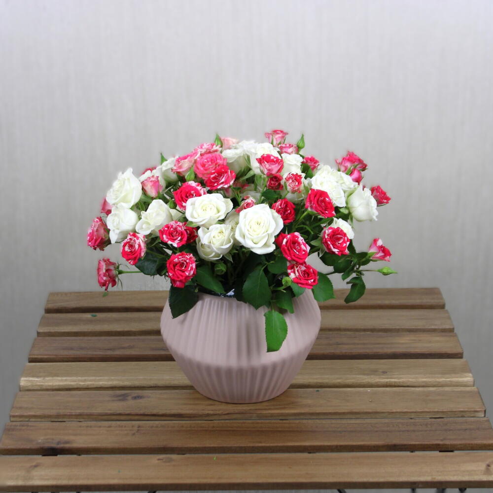 A dazzling arrangement of white spray roses paired with vibrant Fireworks spray roses, beautifully displayed in a sleek ceramic vase. The serene white blooms symbolize purity and grace, while the colorful Fireworks roses add a burst of energy and charm. Together, they create a stunning visual contrast, perfect for brightening any occasion. This elegant arrangement exudes warmth and sophistication, making it an ideal gift or centerpiece for any setting.