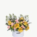 Yellow rose - 10 pcs peach carnation - 20 pcs mathiola white - 10 pcs astromeria white - 5 pcs equaliptus - 5 pcs