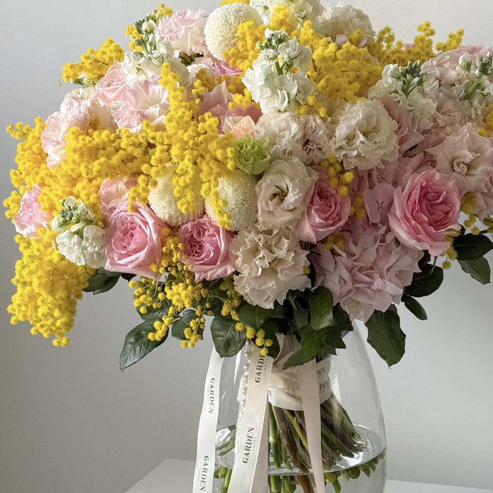 This delicate bouquet in pastel pink and white shades with bright highlights of yellow mimosa is the perfect choice for March 8th. The combination of roses, eustoma, matthiola, and mimosa will emphasize your sincere feelings and admiration, bringing a celebration of love and tenderness. Includes mimosa, O’hara rose, eustoma, Ping Pong chrysanthemum, matthiola, hydrangea. The set comes with a vase, flower bag, personalized card, care instructions and flower fertilizer. *Flower delivery today Perfect for: - a gift for her; - weddings or anniversaries; - birthday; - perfect dates; - gift add-ons; - International Womens Day; - gifts with no occasion; - VIP events or luxury floral surprise.