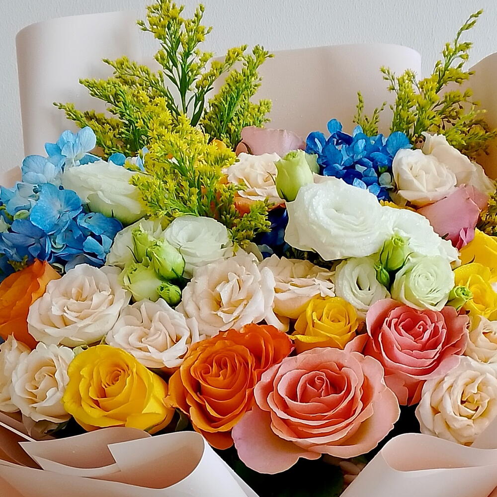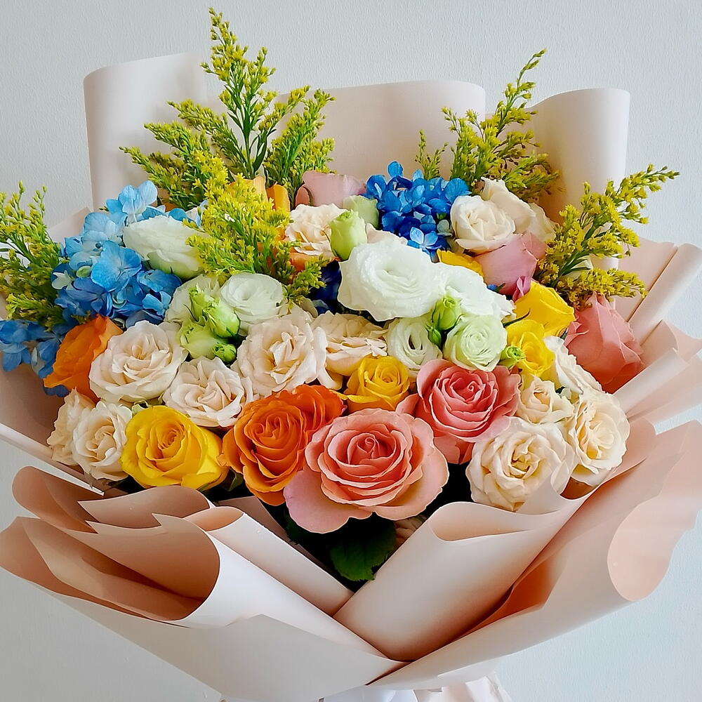 Pastel Harmony is a beautifully handcrafted bouquet featuring a graceful mix of fresh pink, yellow, orange, and white roses, perfectly complemented by vibrant blue hydrangea and delicate solidago fillers. This elegant floral arrangement blends soft pastel tones with cheerful pops of color, creating a fresh and joyful look. The roses symbolize love, appreciation, and happiness, while blue hydrangea represents gratitude and heartfelt emotions, making this bouquet a meaningful gift for your loved ones. Wrapped in premium peach paper and finished with a classic white ribbon, this bouquet is designed to impress and leave a lasting impression. Perfect for expressing warm feelings, celebrating special moments, or simply brightening someone’s day, Pastel Harmony is a timeless choice for flower lovers. 🎉 Best Occasions for This Bouquet This bouquet is ideal for: 💖 Birthday celebrations 💐 Anniversaries 🎉 Congratulations achievements 👶 Baby shower 💝 Thank you gifts 🌸 Get well soon 💍 Engagement celebrations 🎁 Just because / Surprise gift