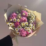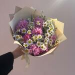 Satin ribbon - 1 pcs tanacetum - 5 pcs matte packaging - 5 pcs camomile - 10 pcs hiacynth - 7 pcs